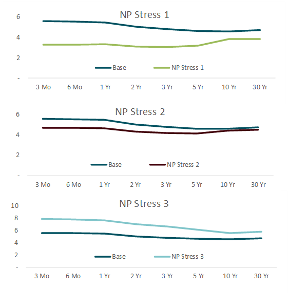 To appropriately manage your earnings and long-term net economic value (NEV) risk, alternate non-parallel yield curves should be evaluated. These should look at the various risks when moving both the slope and level of the curve. Evaluating rising and falling rates as well as shifts in the yield curve helps fully assess the risk to earnings on the curve to give a more realistic view. Not only will it assist with planning earnings expectations, but it’ll also assist with valuation risk.