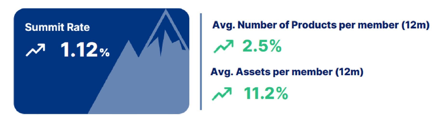 In the last 12 months, Duke University FCU experienced a Summit Rate of 1.12 percent, indicating that member participation grew by a net 1.12 percent when comparing members who increased participation and those who decreased during this time period. Contributing to this participation growth is a 2.5 percent increase in the average number of products per member and 11.2 percent asset increase for this group of members.
