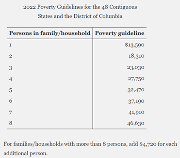 In 2022, the following poverty guidelines were published as figures representing annual income in the 48 contiguous states and the District of Columbia.
