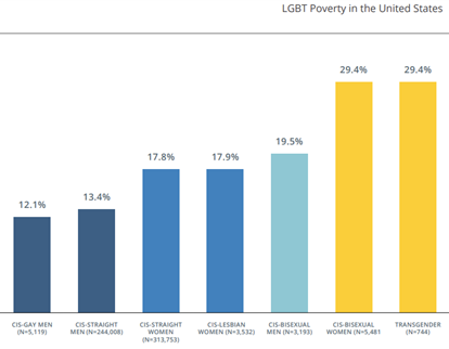The lesbian, gay, bisexual and transgender (LGBT) community also experiences poverty at rates higher than their cisgender counterparts. The graph below was published in October 2019, showing the various breakdowns of those who identify as part of the LGBT community and how they collectively contribute to the poverty rate of 21.6 percent.