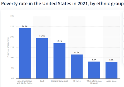 The census data from 2021 indicates 11.6 percent, or nearly 38 million Americans, are living in poverty. The child poverty rate (for people under 18) is 16.9 percent, while poverty for those 65 years old and older is 10.3 percent. We can also see how poverty rates vary by ethnic group, with Indigenous, Black and Hispanic people experiencing higher rates of poverty than white (non-Hispanic) and Asian Americans.