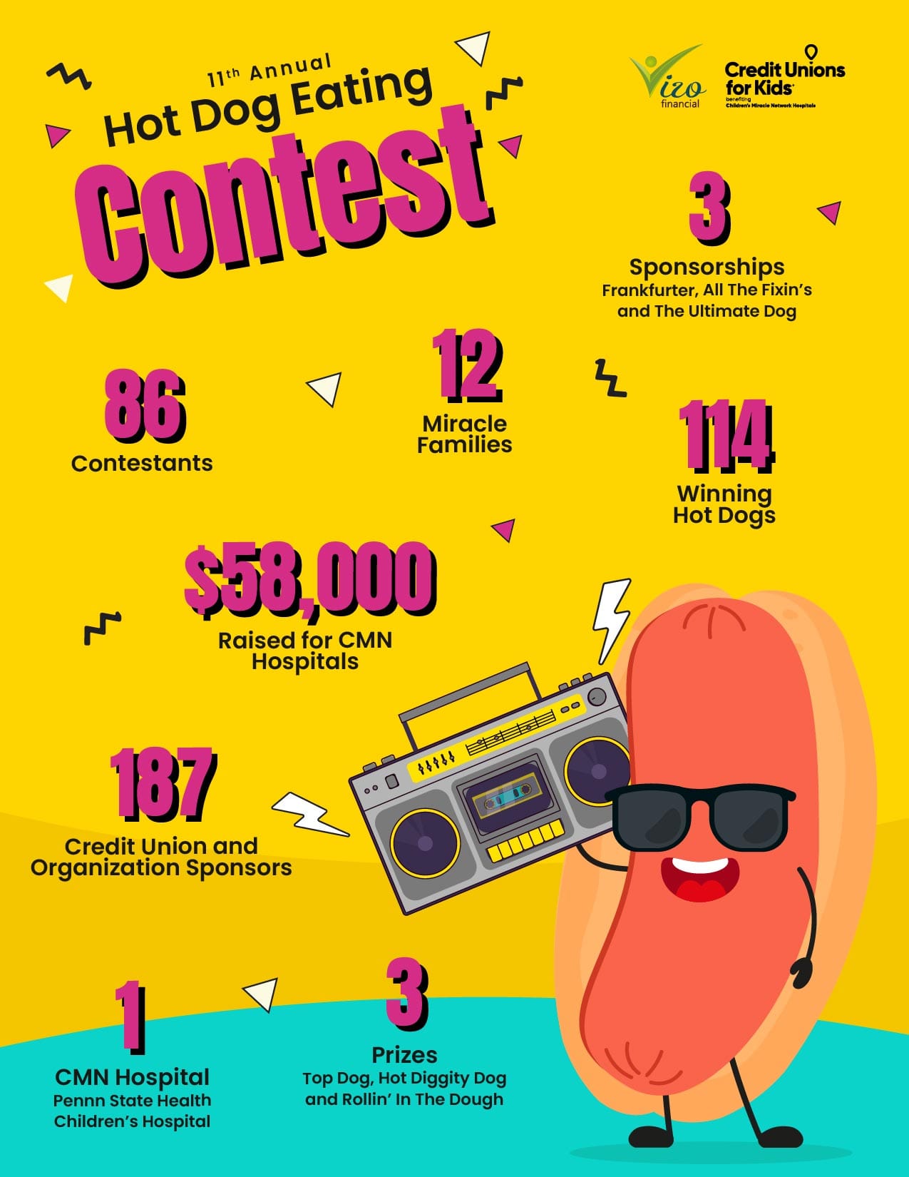 Maybe those miracles are small kindnesses that come in the form of art supplies and stickers, which are given to children to decorate their masks before they undergo anesthesia, or a portable CT scanner that can travel to critically ill or injured children so they don’t need to be moved from their rooms. Maybe others are larger, like a pediatric ambulance that can transport a child to the hospital just in the nick of time. Regardless, the Hot Dog Eating Contest is crucial in Vizo Financial’s efforts to make those miracles happen for children who are treated at CMN Hospitals at Penn State Health Children’s Hospitals.